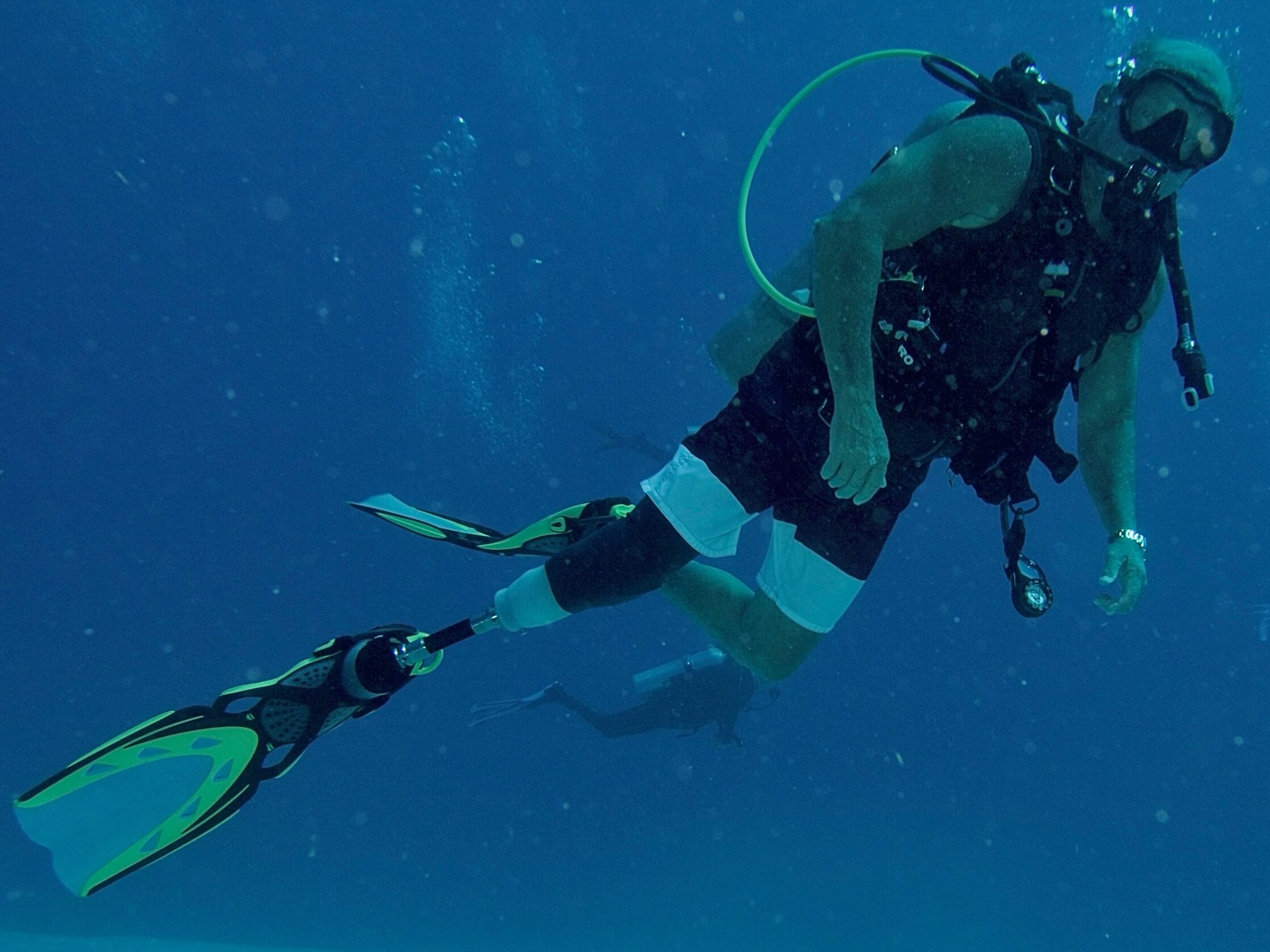 In the early years, prosthetic technology made diving difficult. Water-sports-oriented prosthetic components were limited, and traditional ankle mechanisms did not accommodate swim fins. That changed in the early 2000s when Rampro introduced the Activeankle, a device that allowed a prosthetic foot to remain comfortably plantarflexed underwater. “It made all the difference,” he recalls. He used that ankle for nearly 25 years before transitioning to a similar system by OttoBock, designed specifically for aquatic activity.